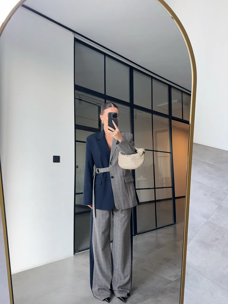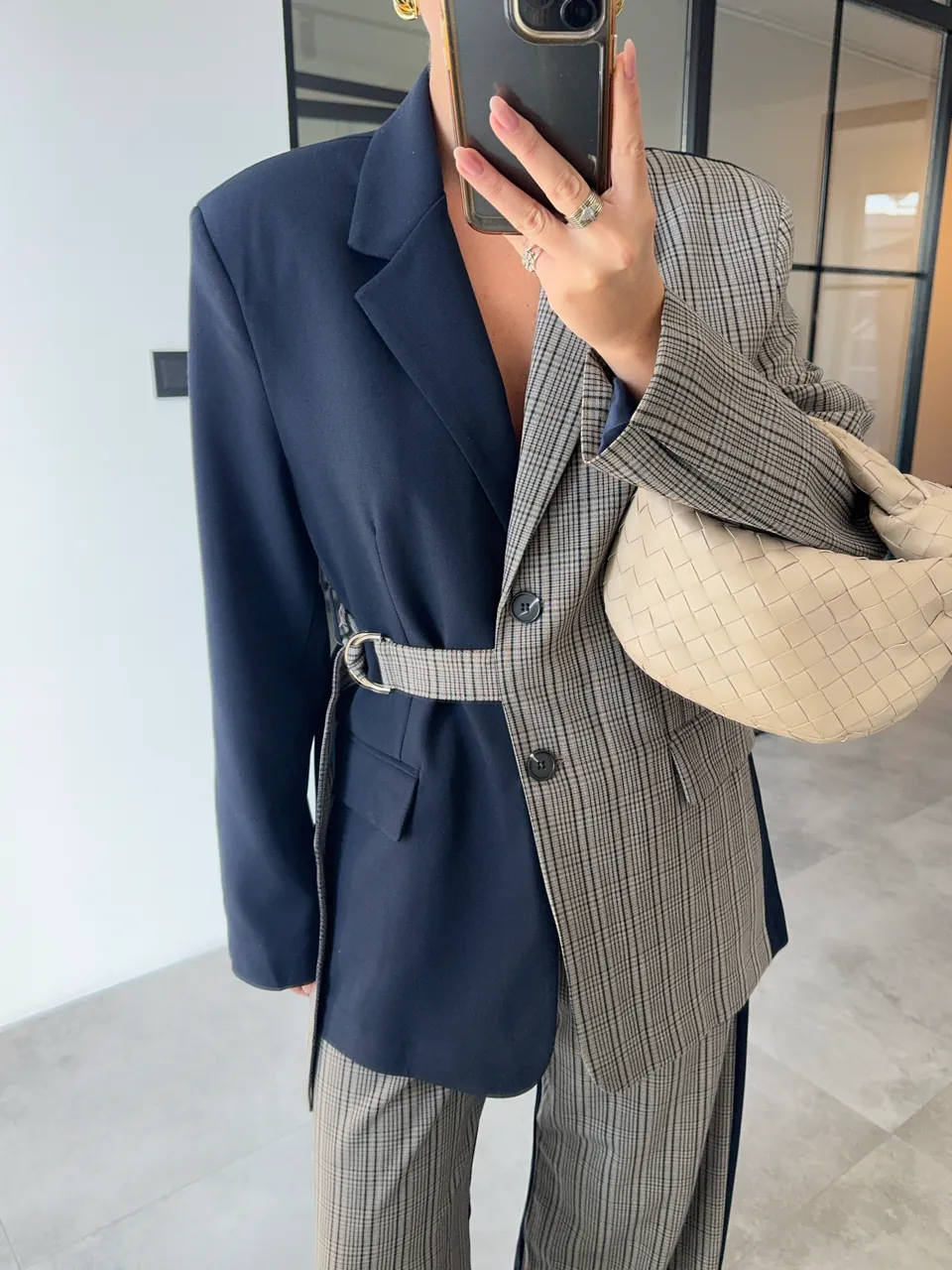 De ultieme power look. Deze navy set met subtiel geruit patroon combineert een getailleerde blazer met ceintuur en een elegante palazzo broek. Draag samen voor een complete look of apart voor veelzijdige combinaties.