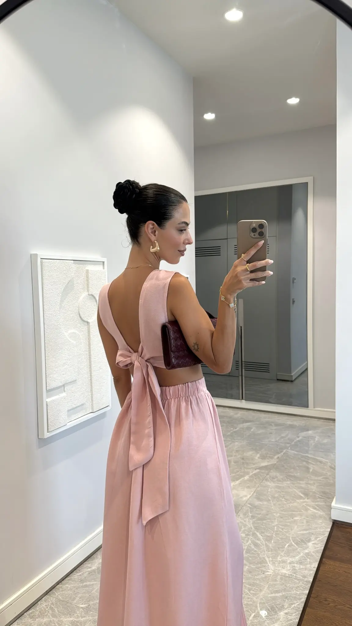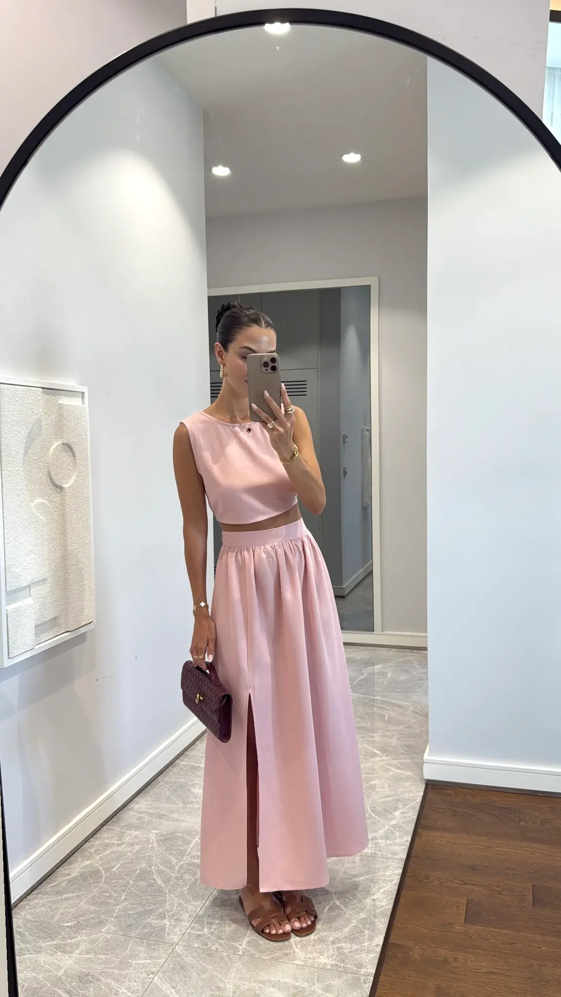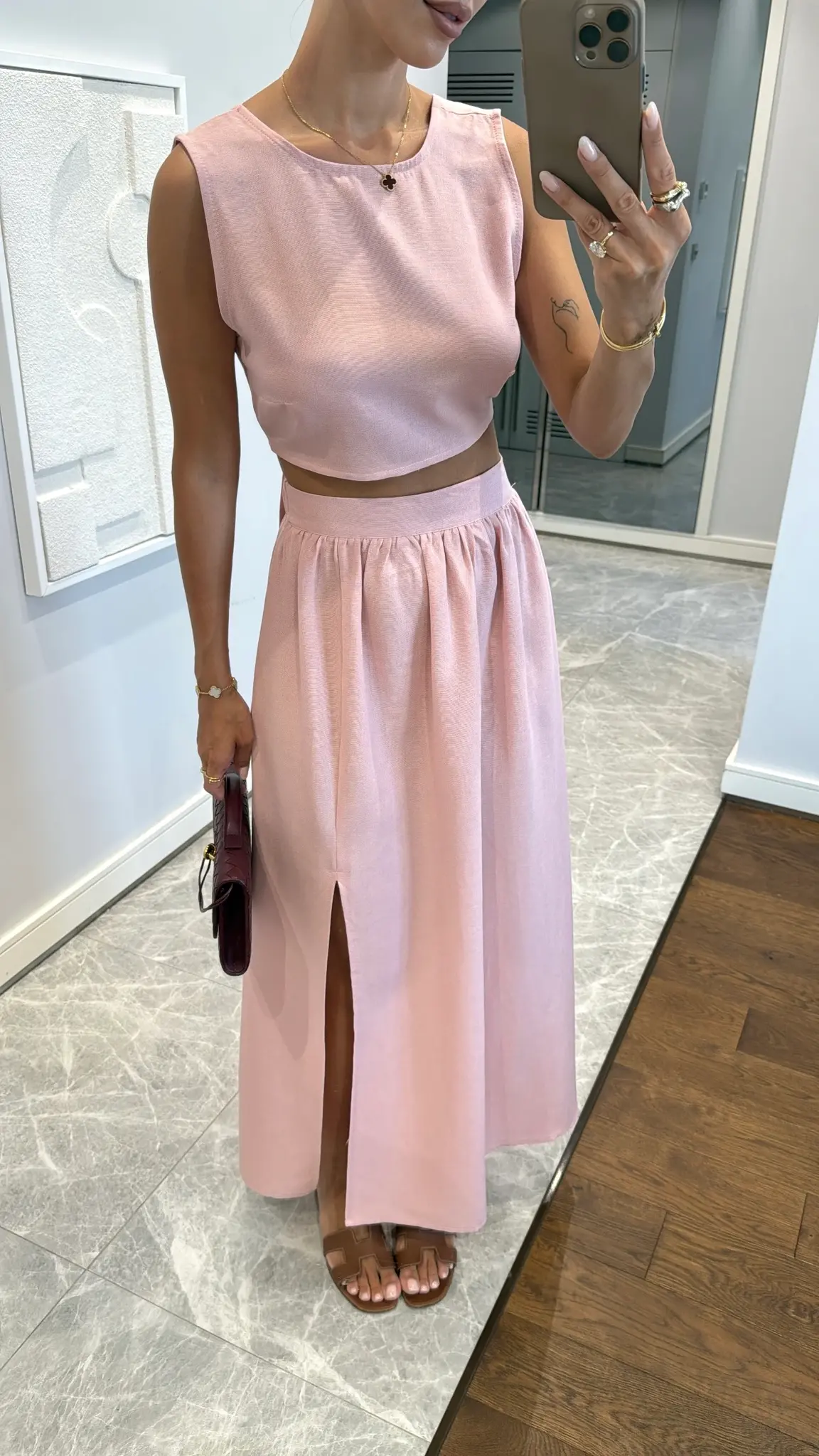 Deze roze elegante 2-delige set met een schouder accentuerende crop top en een high-waist rok met split straalt vrouwelijkheid en zelfvertrouwen uit. Gemaakt van licht linnen – perfect voor zomerse dagen.