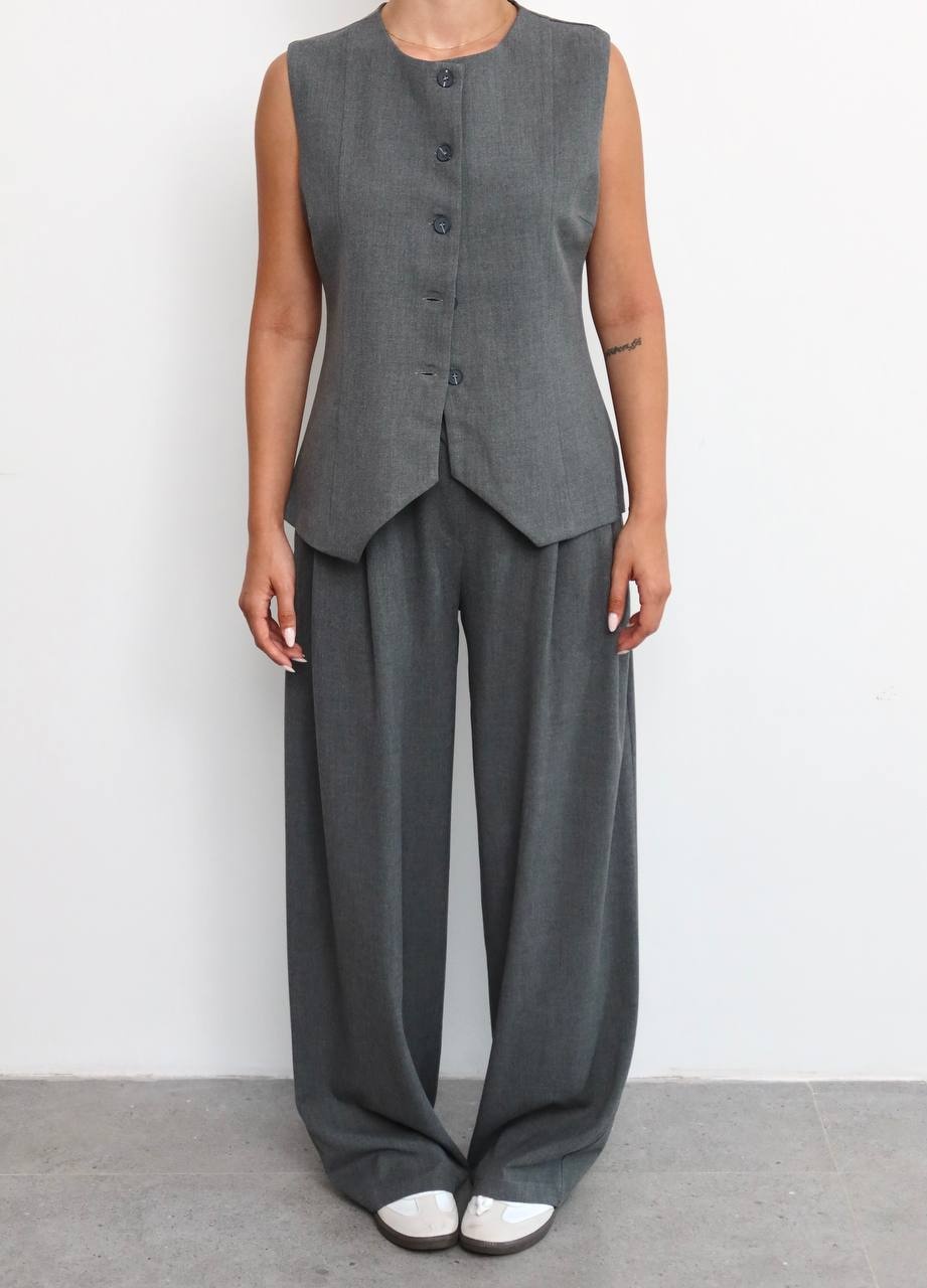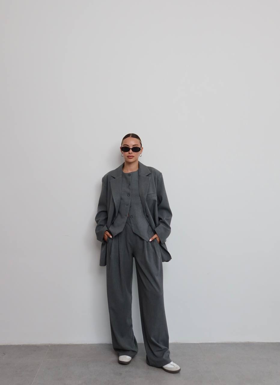 Dit geweldige damespak met gilet mag niet ontbreken in je kledingcollectie. Dit damespak bestaat uit een dames gilet , blazer en een bijpassende pantalon. De pantalon heeft elastiek in de rug en sluit met een knoopsluiting voor.