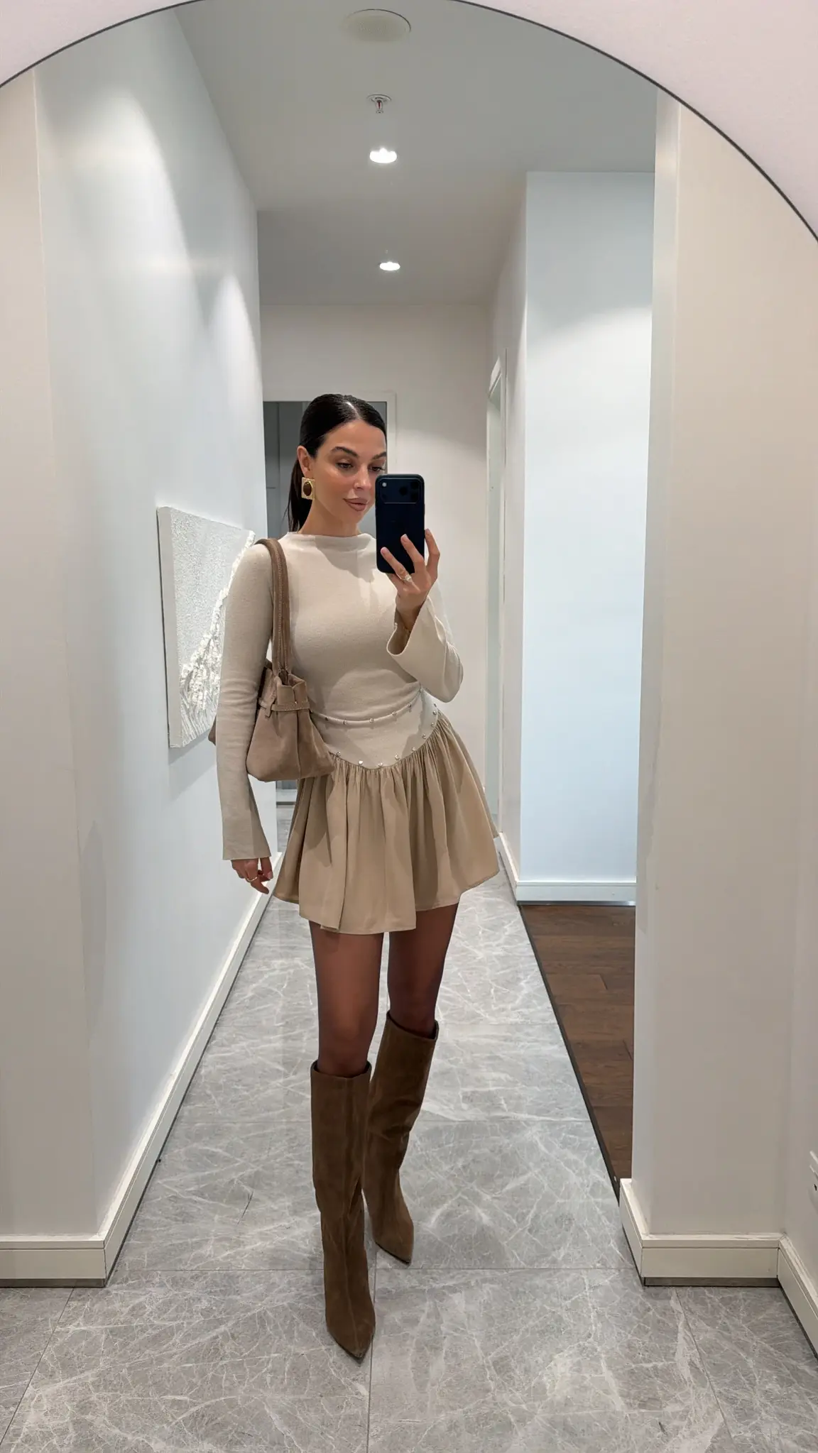 - Het model is 170 lang en draagt maat S.